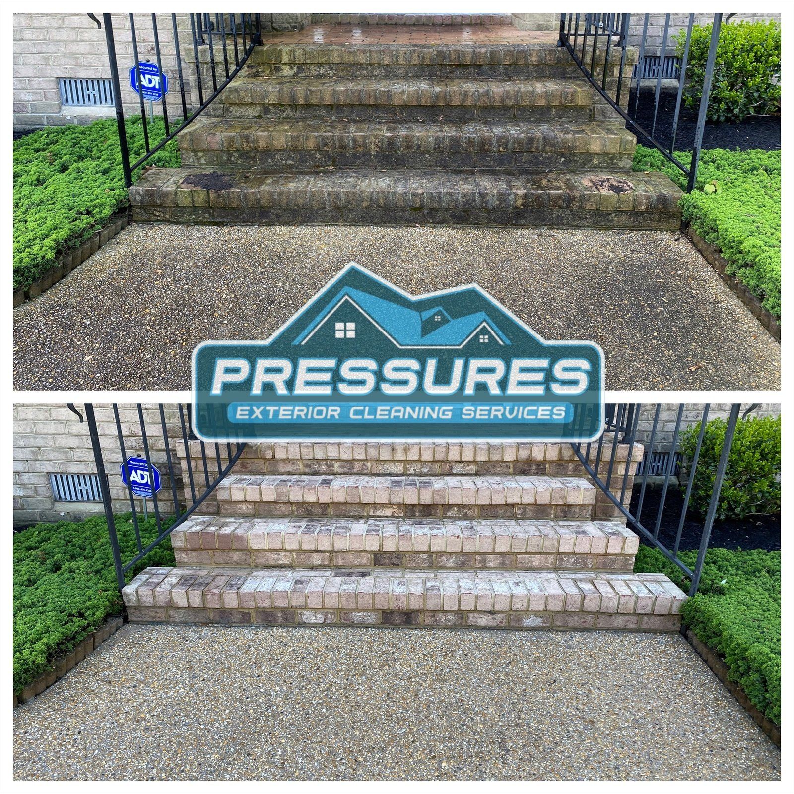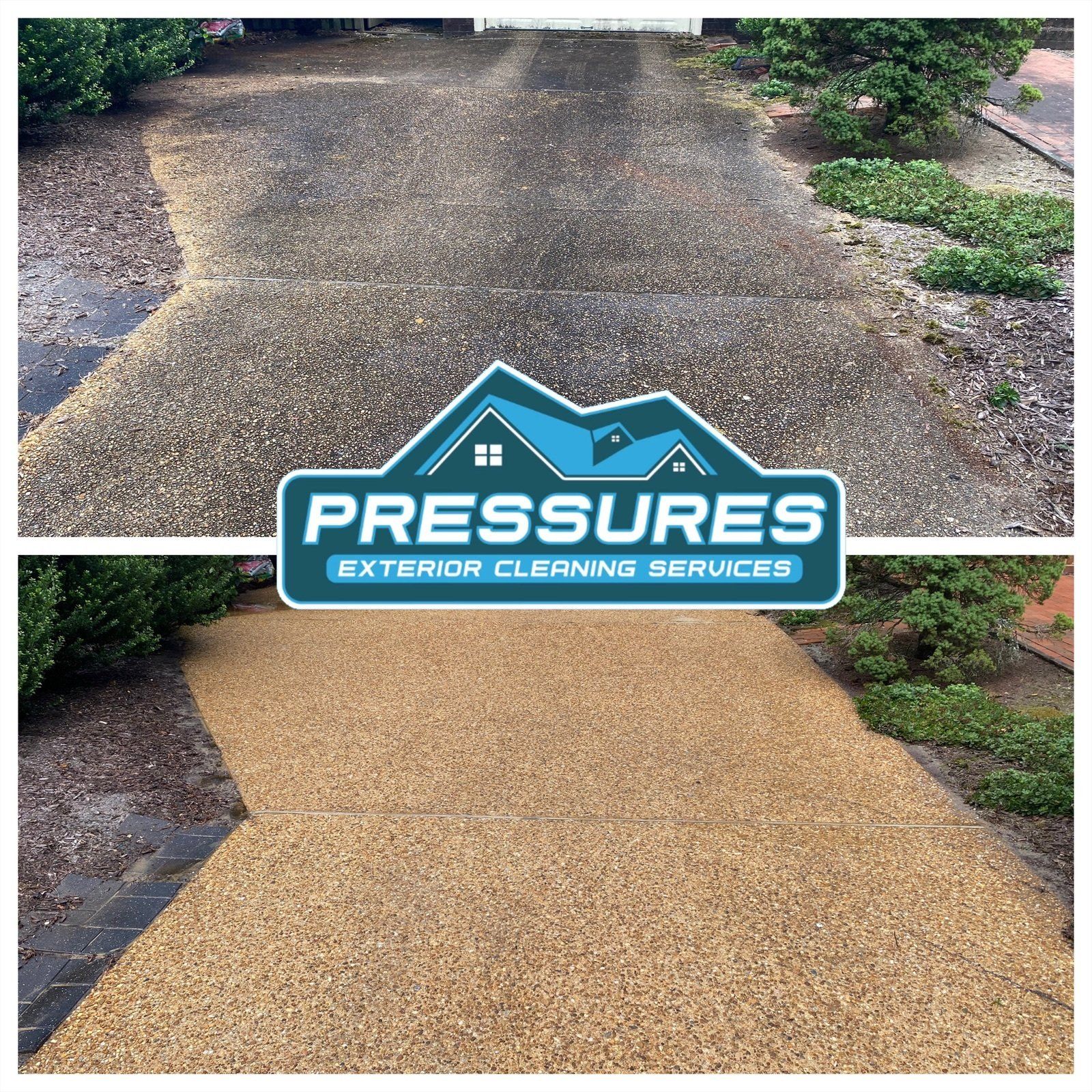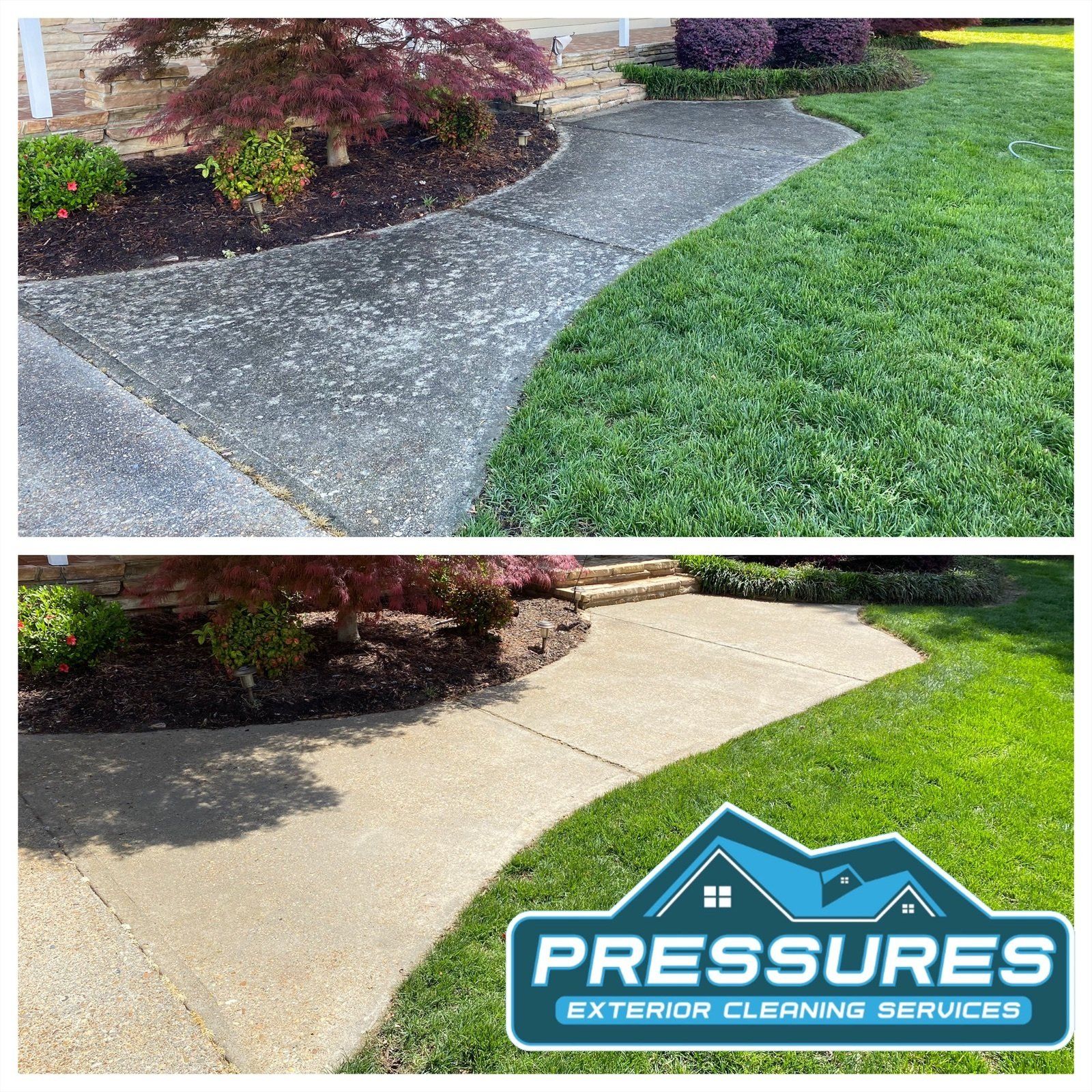 Pressure washing is best for cleaning concrete surfaces such as patios, driveways, and sidewalks but we still use our cleaning solutions along with the pressure cleaning to ensure the best outcome every time.